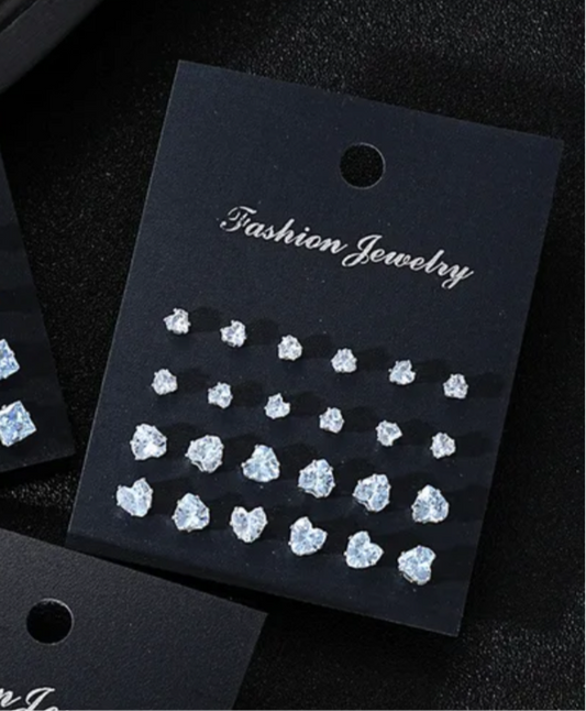 12 Multi Pack Silver Heart Rhinestone Diamond Stud Earrings Set