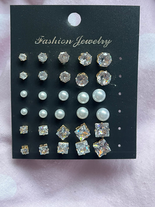 15 Pairs Set Diamond Pearl Silver Studs Earrings